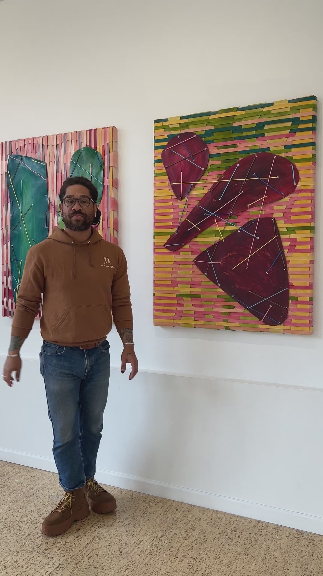 Created as a diptych portrait of my husband, this is the first piece that abstractly conveys his likeness. His love for bright colors is showcased here, including his favorite color, pink. The wavy weaving and overlapping paracord highlight his exuberance and his beautifully neurodivergent mind.