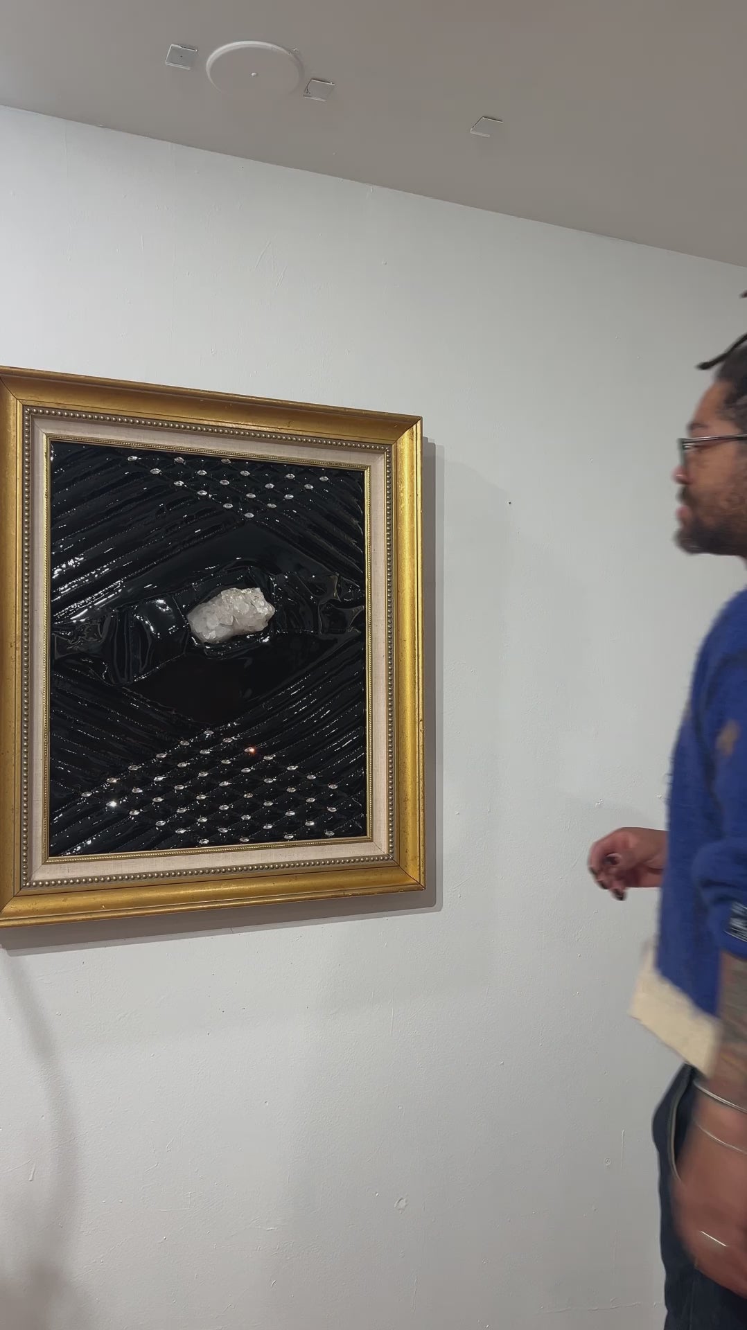 This is an abstract portrait of my dear friend, Diamond, and showcases rhinestones, stitching, and a large crystal quartz to highlight the various interpretations of a diamond.